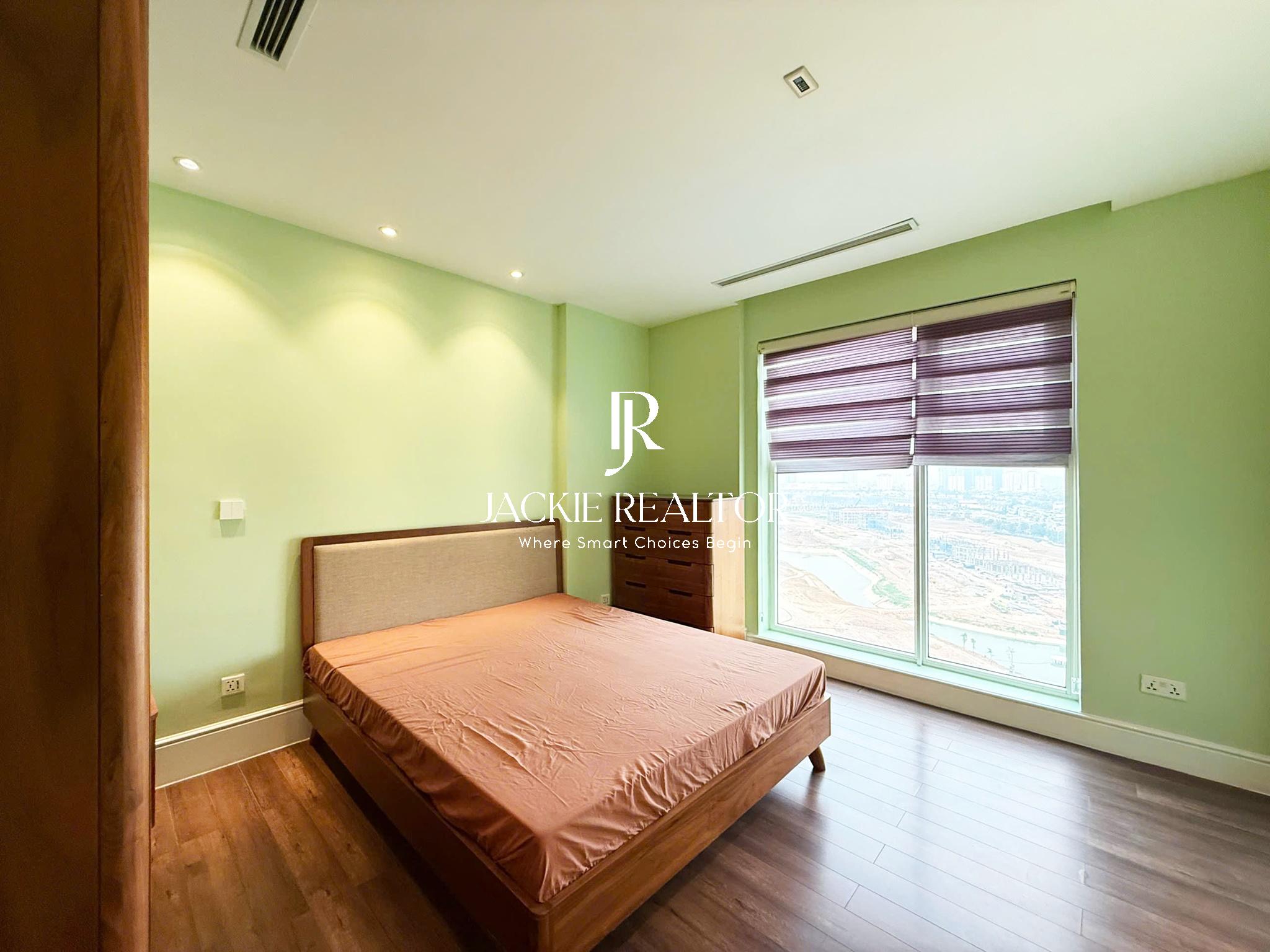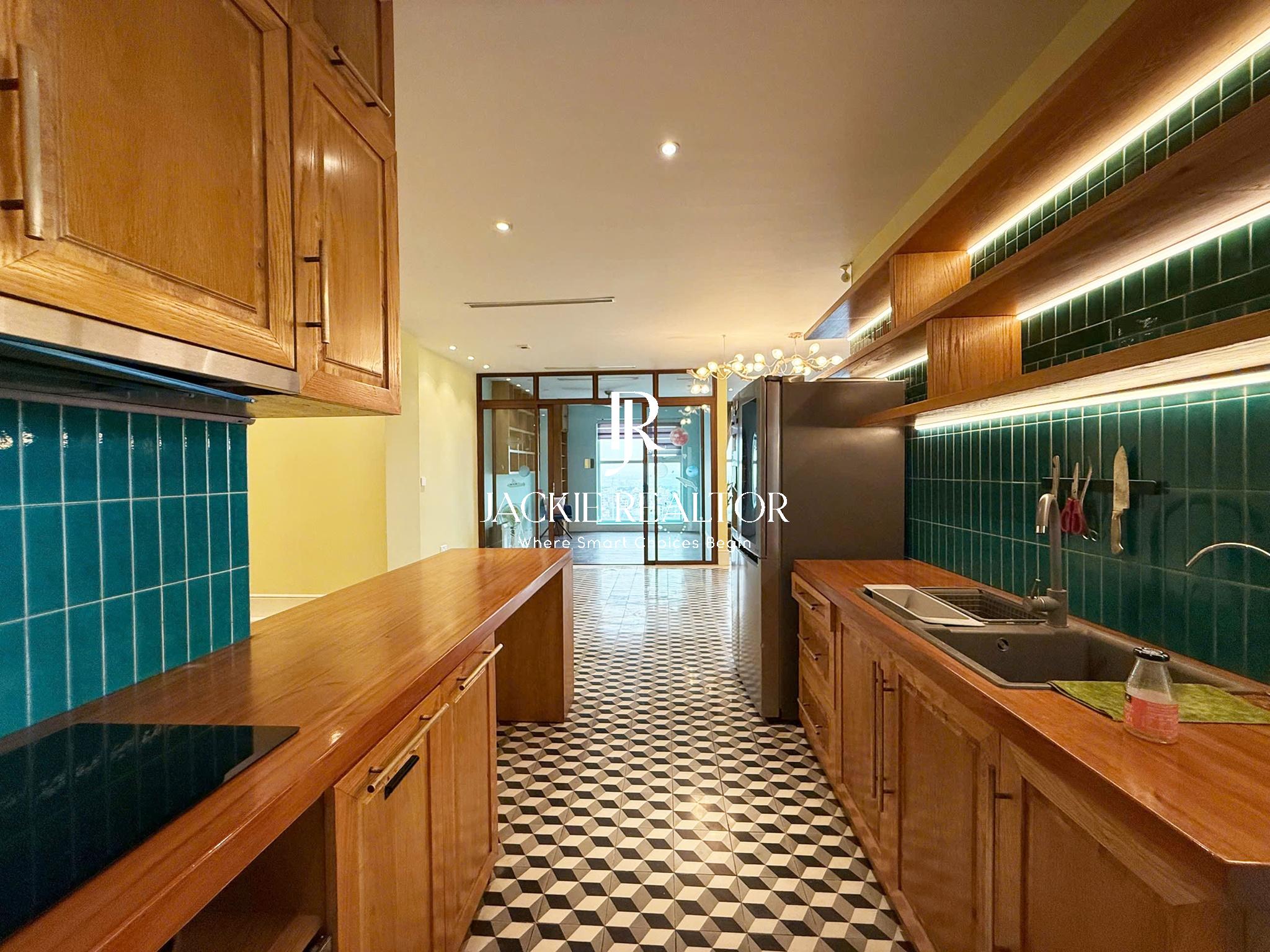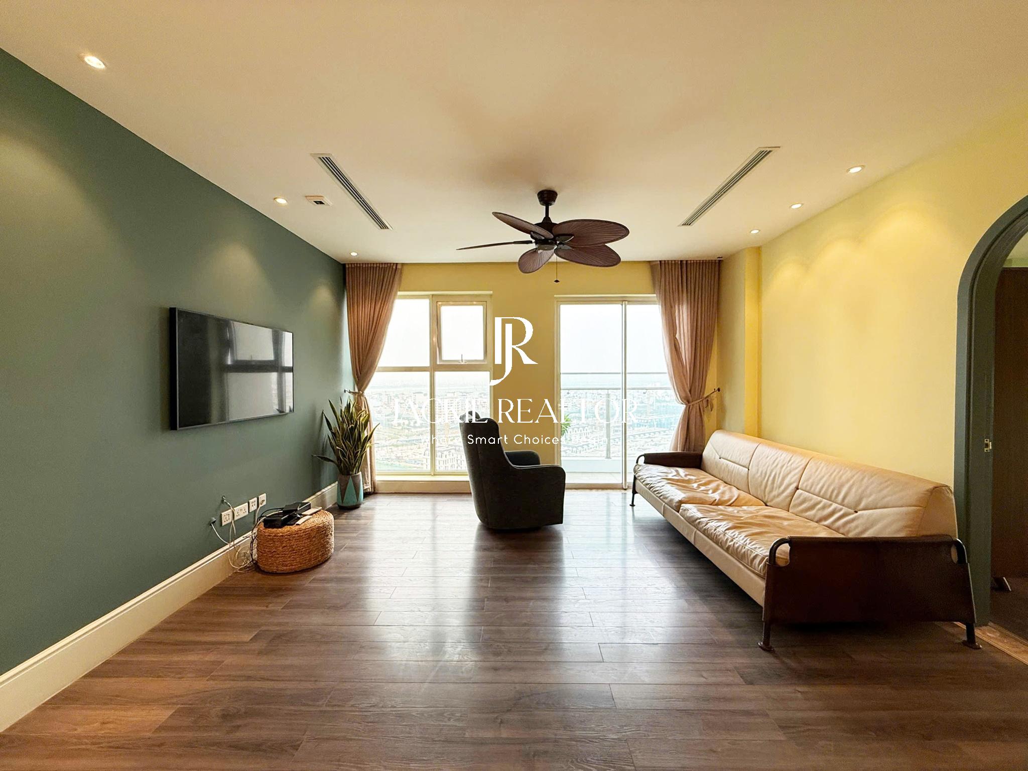 The apartment is located at L5 building, The Link 345 project in Ciputra Hanoi international urban area. With a total usable area of 154 sqm, this apartment is well renovated in an Indochine-style and laid out with 3 bright bedrooms and 2 self-contained bathrooms. The living room is facing the golf course and very cool in summer. The dining area is spacious with a modern open kitchen fully provided with branded equipment.