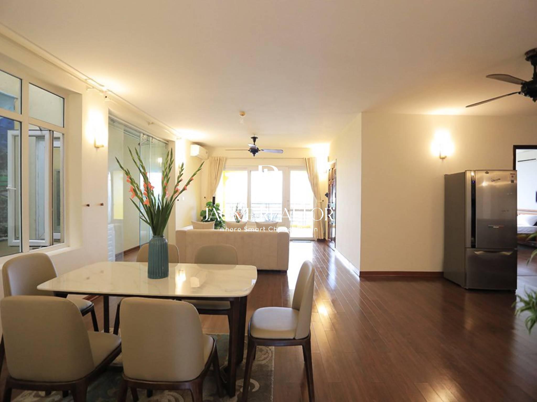 The apartment is located on the lakeside on Tu Hoa street. And the apartment will also be an ideal place for a family with many members or those who prefer a spacious place because the usable area is up to 220sqm. Very bright and airy design including 3 bedrooms and 3 bathrooms, living room with lake view and super large balcony, spacious dining room, modern kitchen.
