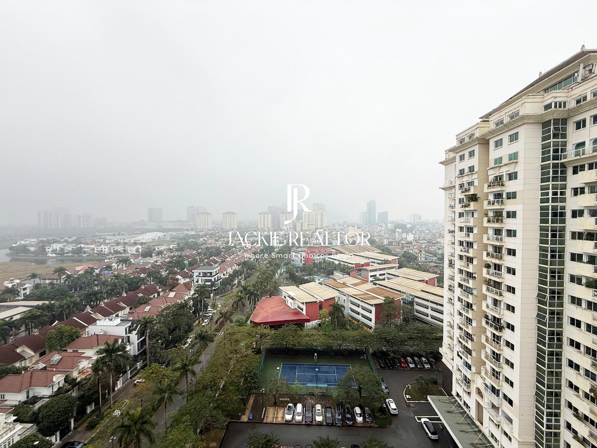 The apartment is located on quite high-floor level of E4 building - In the center area of Ciputra Hanoi international urban. Owning a huge area of 153 sqm, this apartment is nicely designed with 3 bright bedrooms plus one office room, 2 self-contained bathrooms. A big living room with a large long balcony to get much natural light. An open & modern kitchen fully provided with good kitchen equipment. A cozy dining area will be a place for everyone to have meal together.