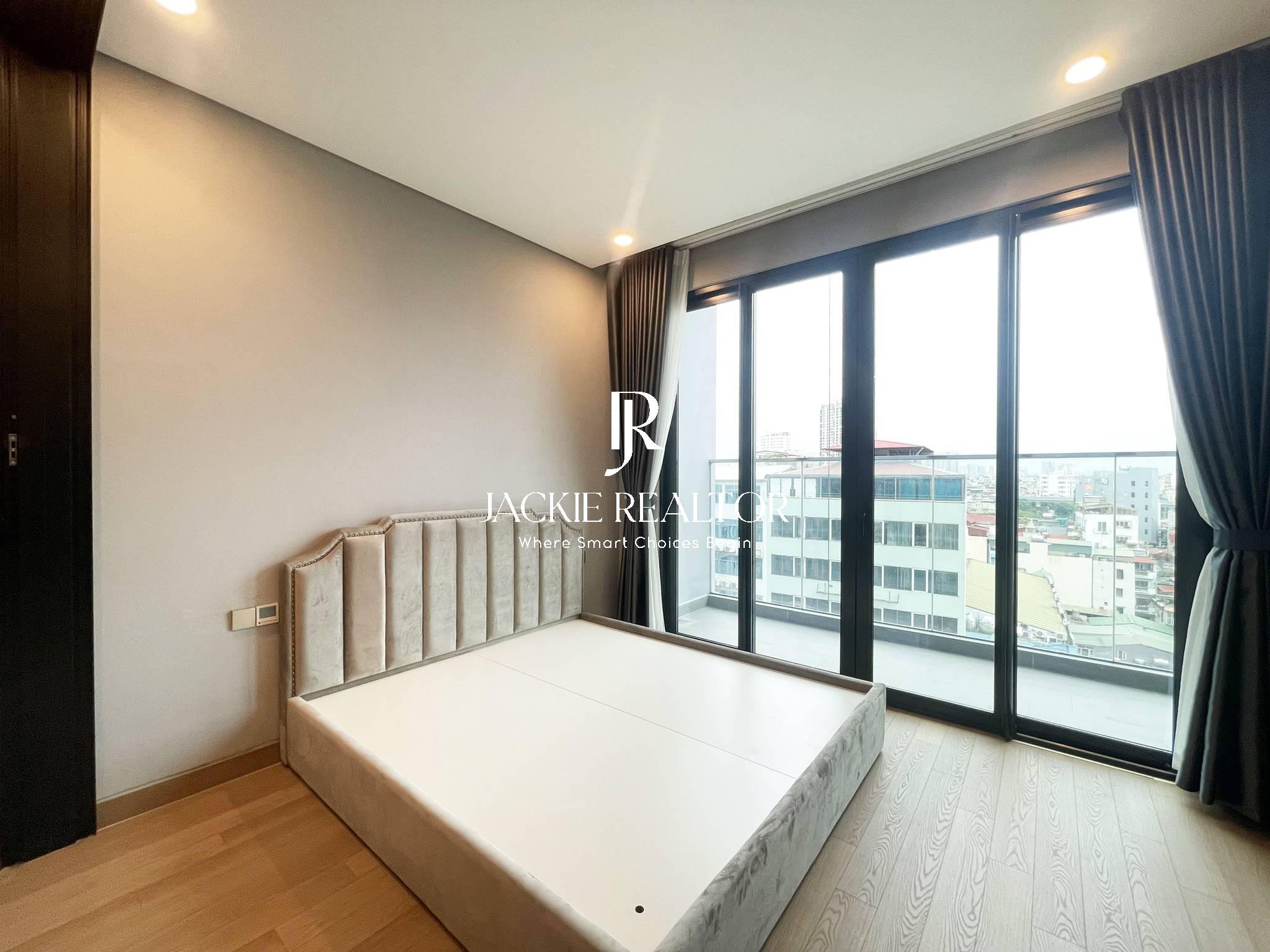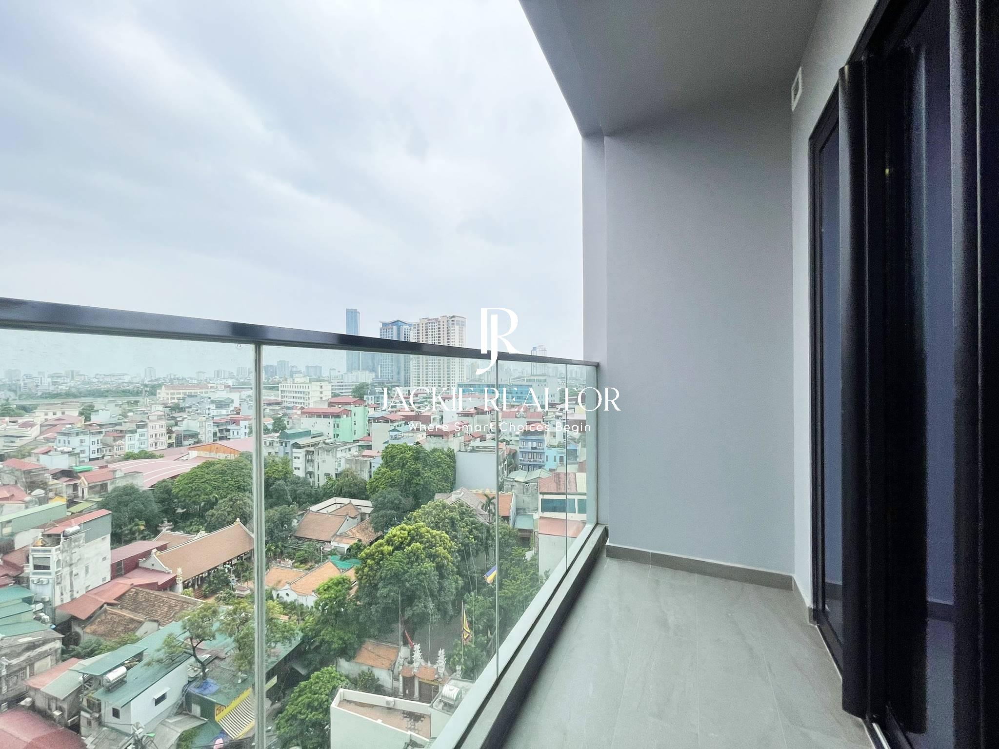 This flat for rent is located at Lancaster Luminaire project with an area of 45 sqm. It's designed as a studio apartment style but has a slide door to separate the living room and bedroom. Besides, this bedroom has a large balcony with a nice view of Lotte Lieu Giai tower that is very beautiful in the evening. This rental studio also has a long kitchen with a dining space. And an ensuited bathroom with a toilet, a shower, a mirror, a sink and a cabinet equipped.