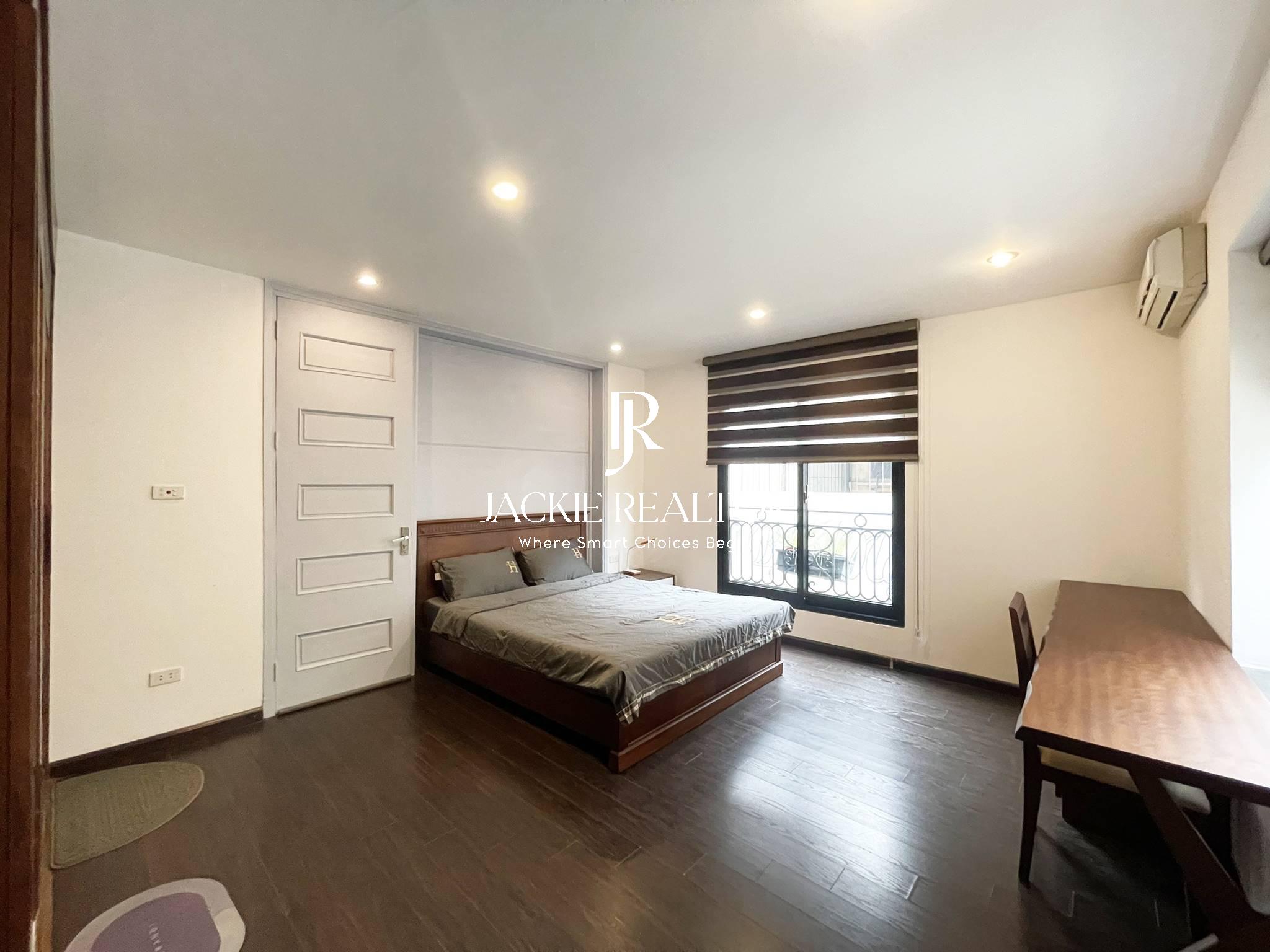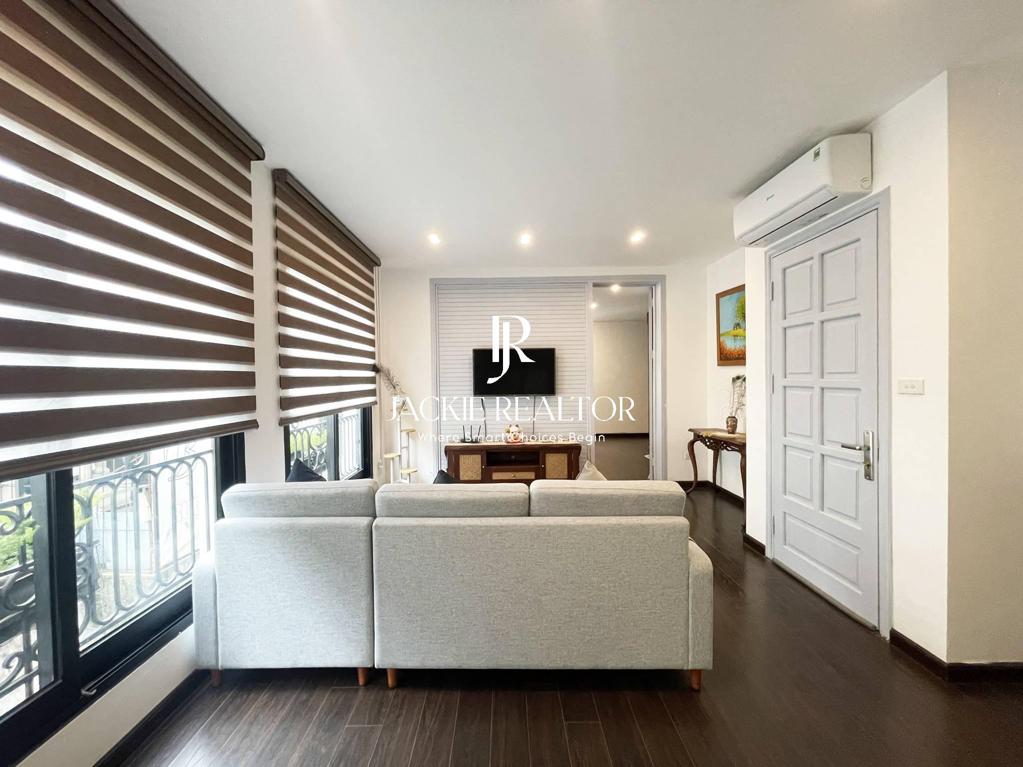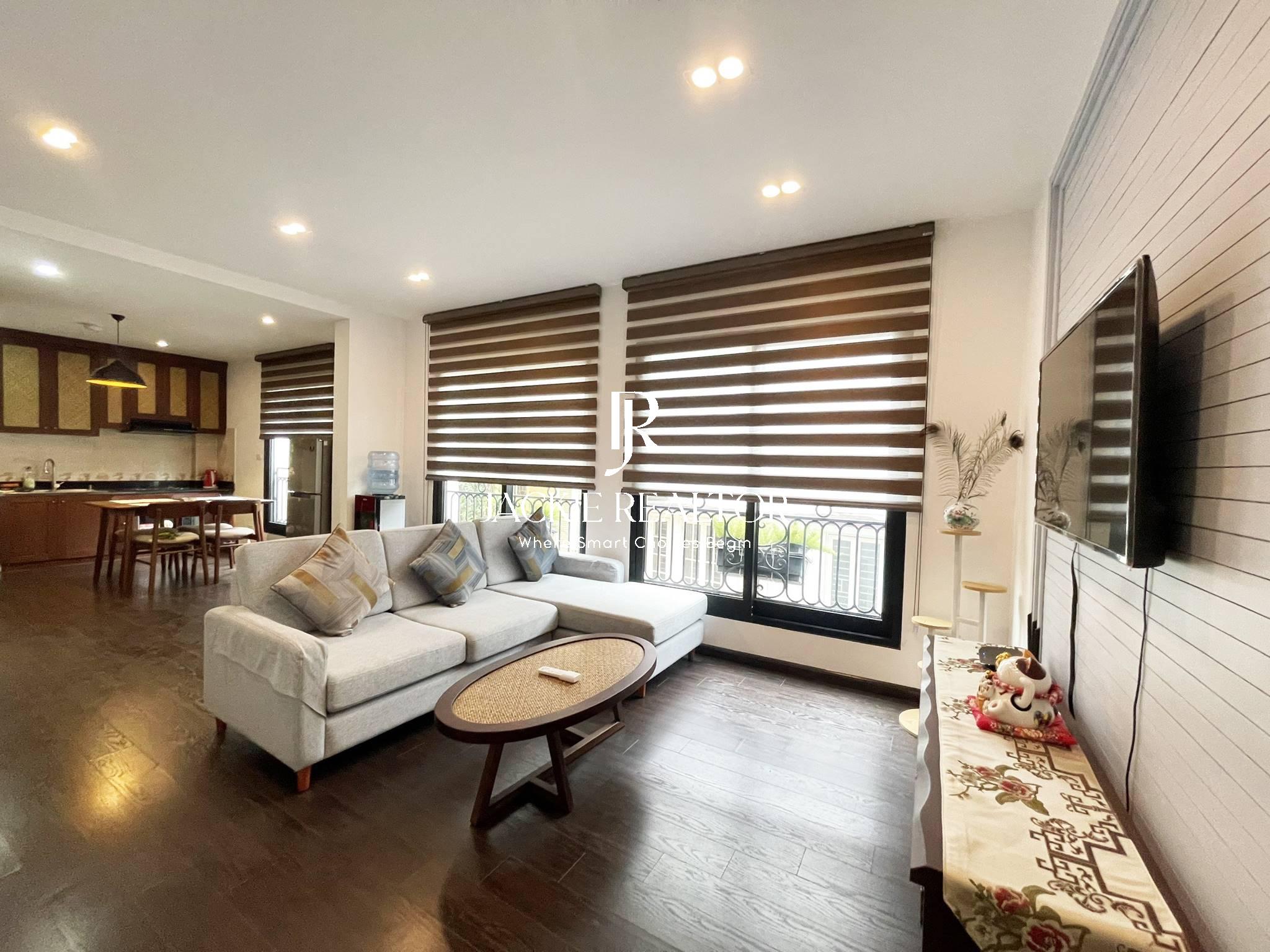 This serviced apartment is located on the lane No. 31 Xuan Dieu Street that is very quiet and safe. It owns a nice area of 80sqm with 2 bright bedrooms and 2 ensuited bathrooms, a big living room, a modern kitchen, and a dining area. The apartment has been beautifully renovated in Japanese style. The interior is also expensive and the electronics are high-end.
