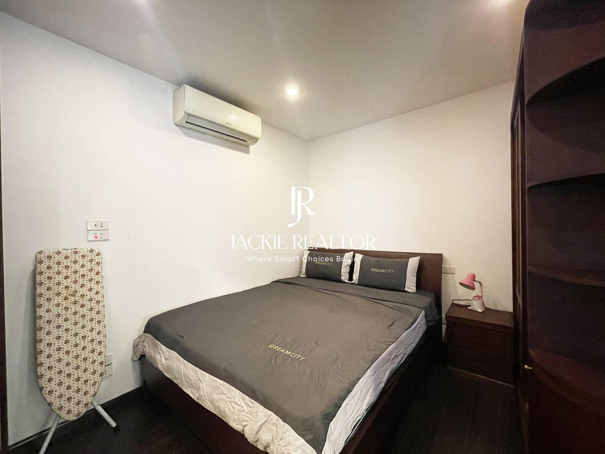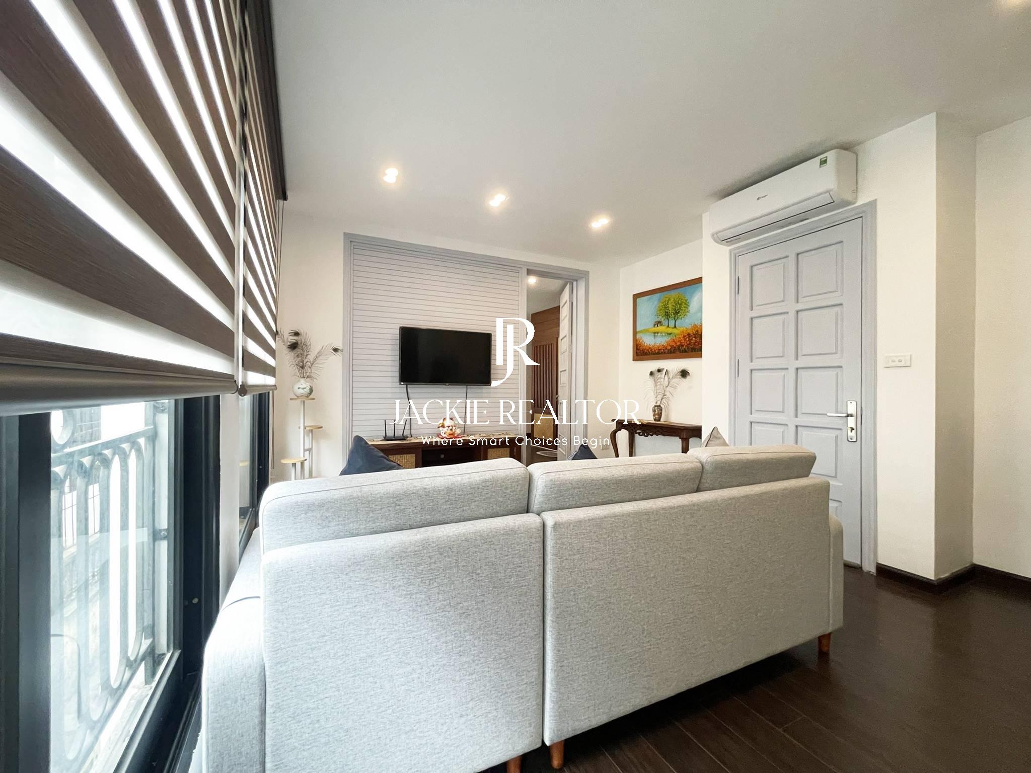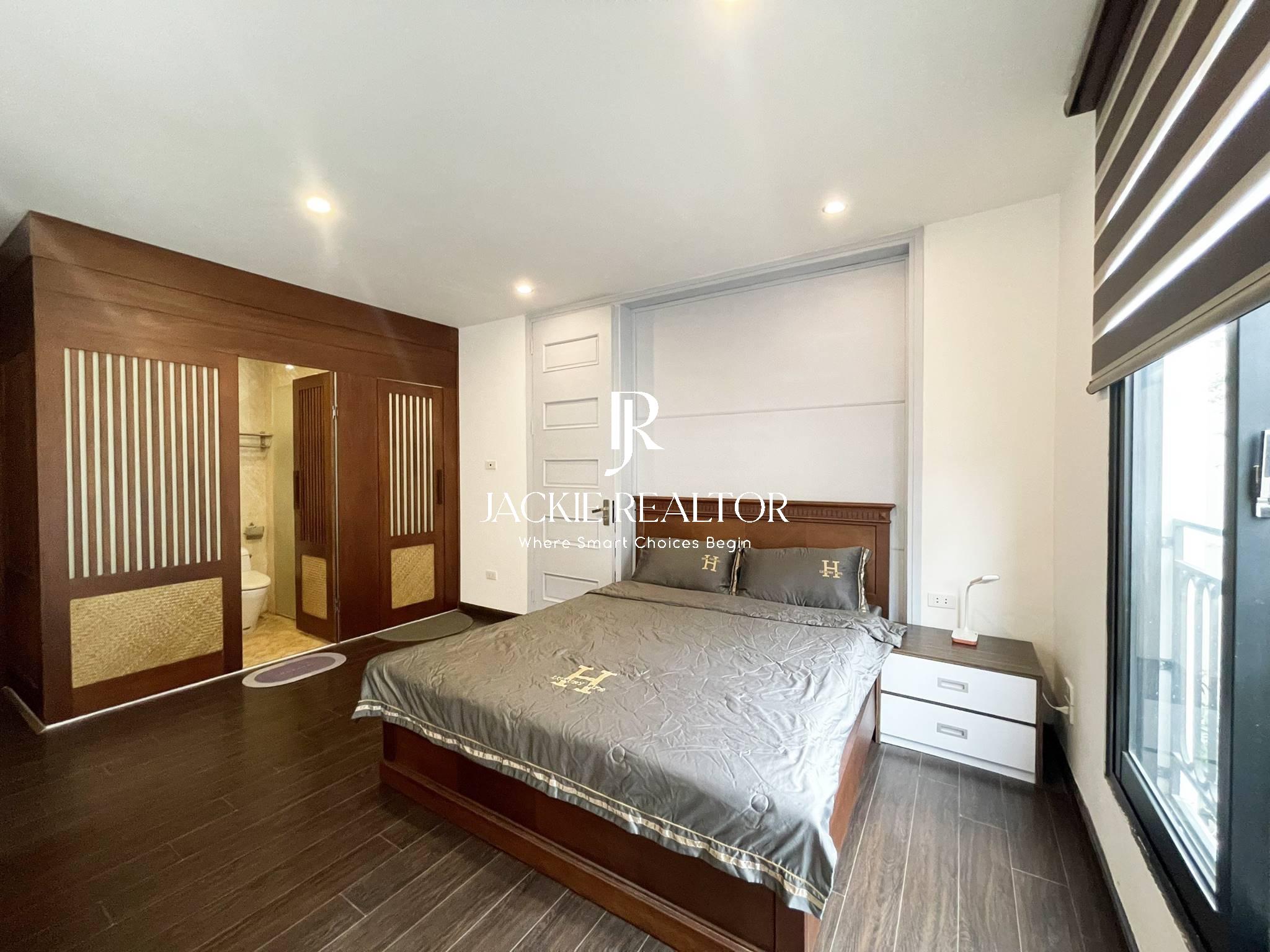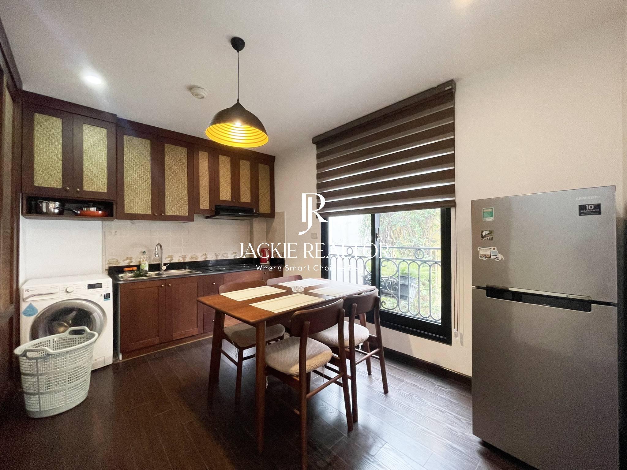 This serviced apartment is located on the lane No. 31 Xuan Dieu Street that is very quiet and safe. It owns a nice area of 80sqm with 2 bright bedrooms and 2 ensuited bathrooms, a big living room, a modern kitchen, and a dining area. The apartment has been beautifully renovated in Japanese style. The interior is also expensive and the electronics are high-end.
